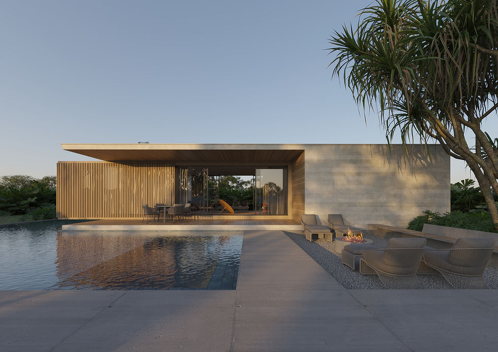 Residência de arquitetura essencial e horizontal, onde madeira, pedra e água criam uma composição serena integrada à paisagem.